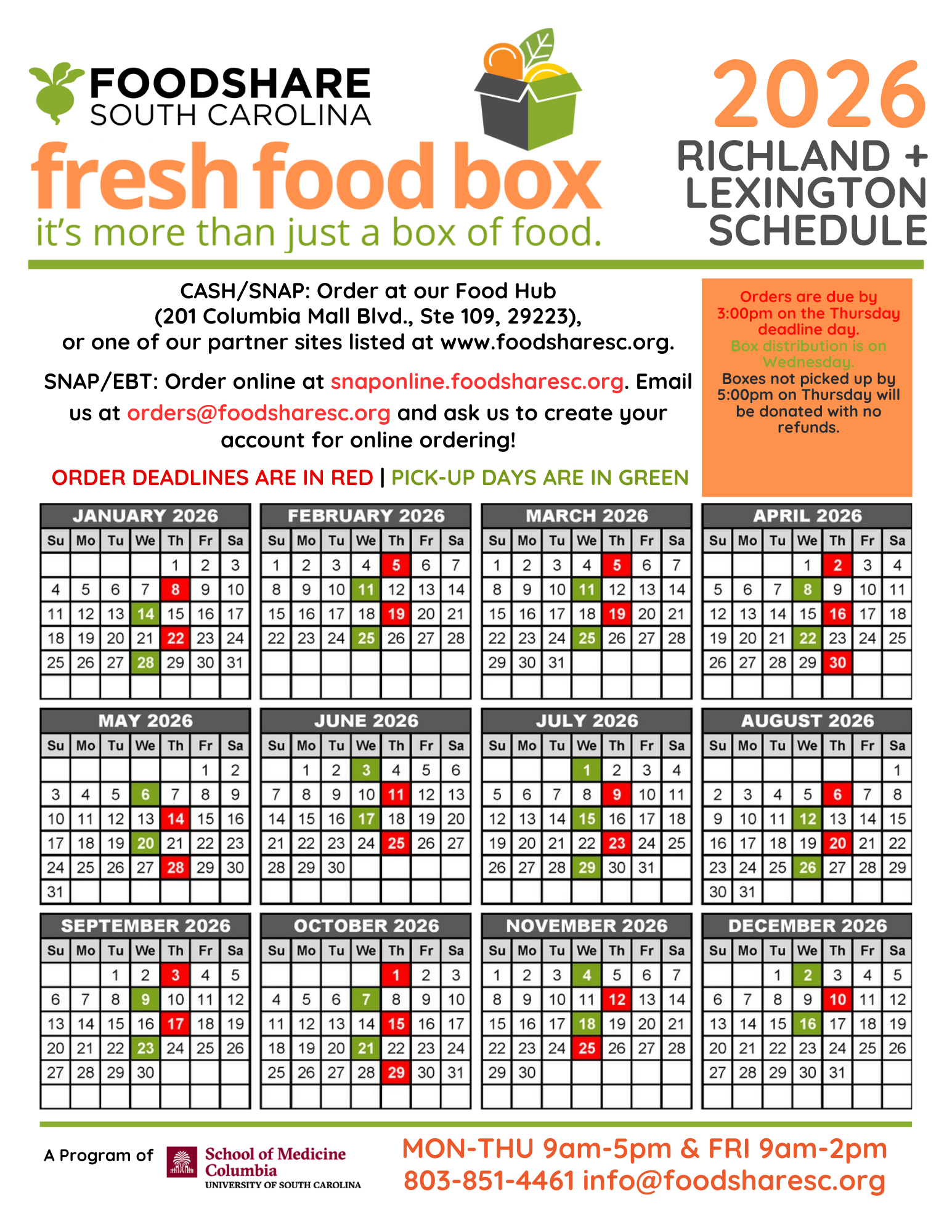 Please order in person in our office, 9:00 am to noon. We can only take cash. EBT or SNAP customers order directly on the FoodShare website.
